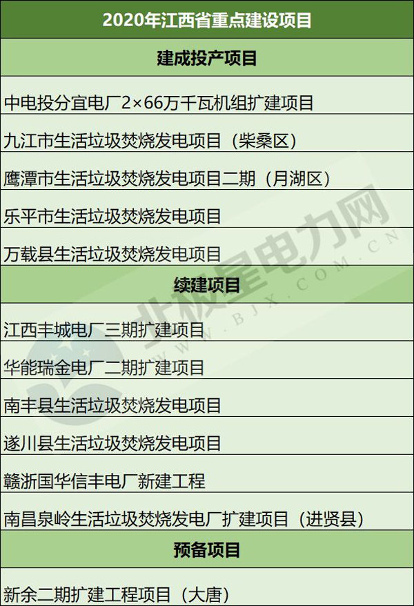江西省2020年第一批省重點建設(shè)項目計劃中,涉及的火電項目、垃圾焚燒發(fā)電項目如下: