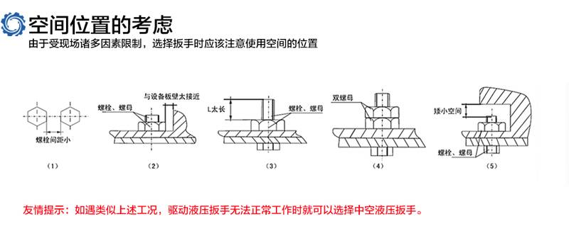 3、現(xiàn)場的工況及空間尺寸:如果使用現(xiàn)場是對空間沒有限制的情況下,適合選擇驅(qū)動液壓扳手使用,因?yàn)橥ㄓ梅秶^廣;如果現(xiàn)場使用有空間要求,或者工況比較特殊,此時盡量選用中空液壓扳手。